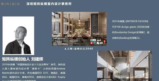 回归东方,将东方风格的作品发扬光大,让中国的设计走向世界,代表作有上海金地公元2040杏彩体育、港龙融创山水拾间、杭州绿城和庐生活馆等。