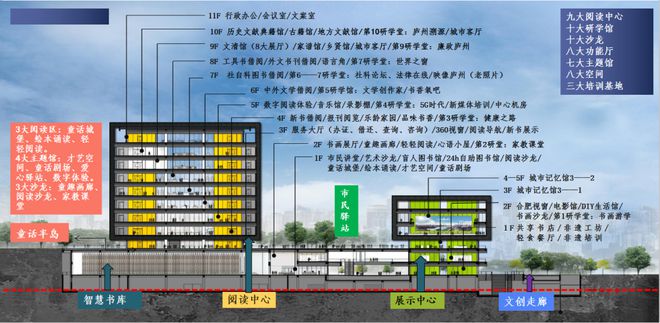 分为阅读文化空间、智慧书库、童话半岛、展示中心、文化驿站、文创走廊等六大功能板块56个多元文化文化空间。