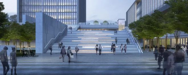 项目通过空间交错、抬升下沉的手法,结合玻璃幕墙、下沉广场、斜坡式大台阶以及二层城市观景平台,打造开敞、亲和的现代图书馆。
