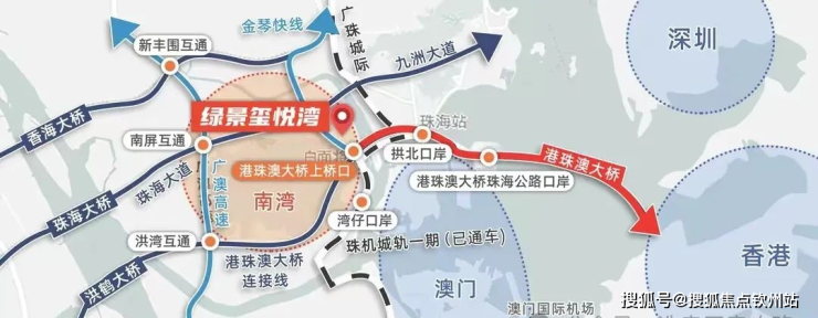 南湾位于香洲主城,西连金湾与斗门两大潜力洼地,南接横琴大桥和横琴杧洲隧道等路网,是珠海市内交通的枢纽中心。