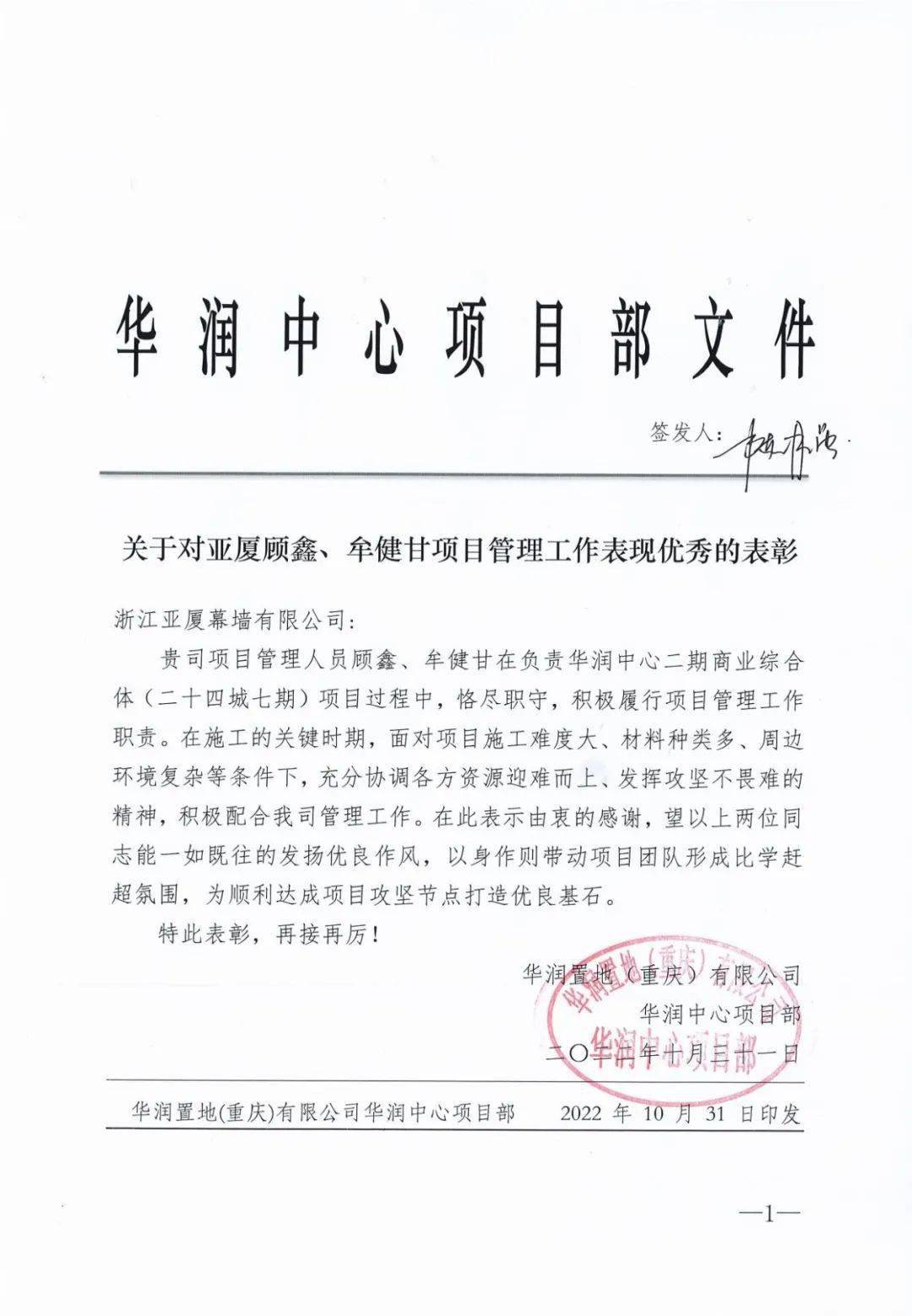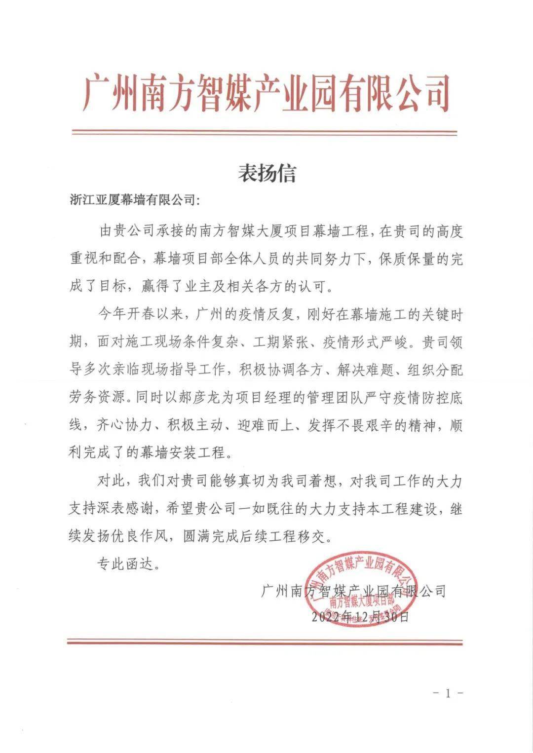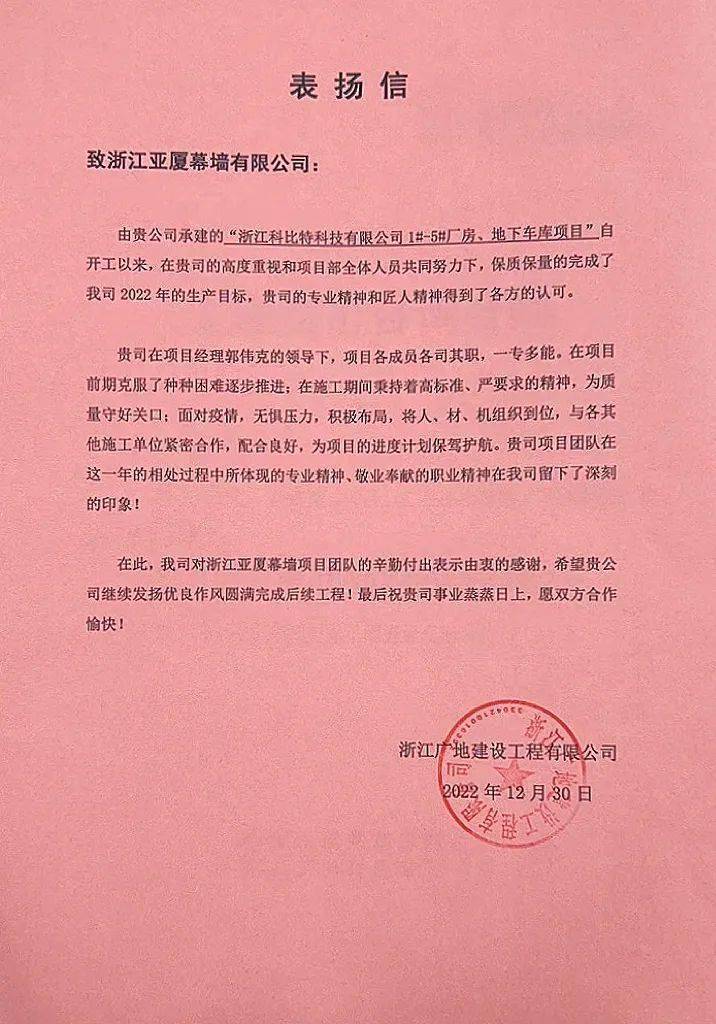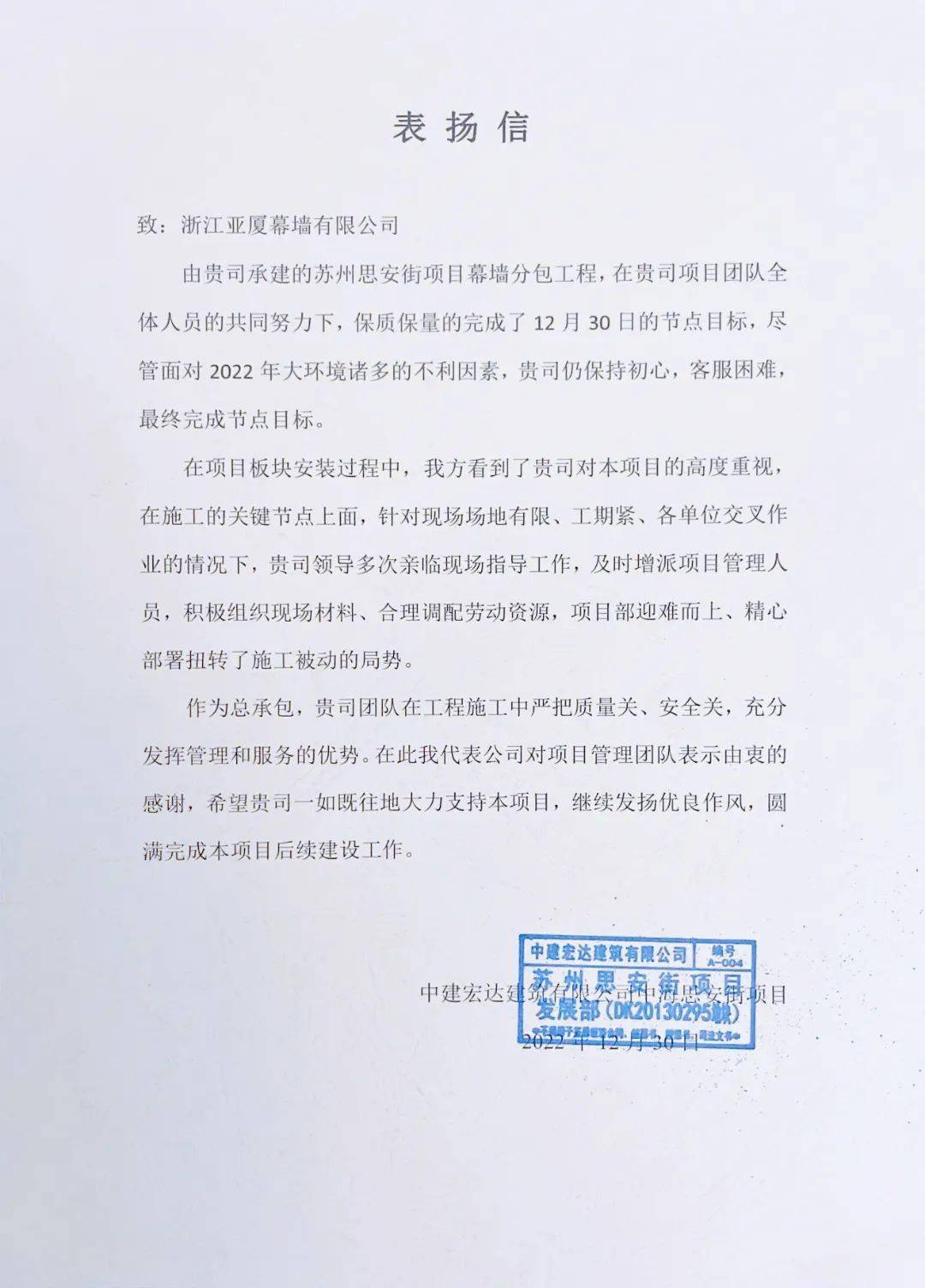 表扬信、感谢信、荣誉证书纷至沓来,每一个高难度项目的攻克、每一次使命必达的交付,共同汇聚成亚厦幕墙披荆斩棘、逆势而上的强大力量。