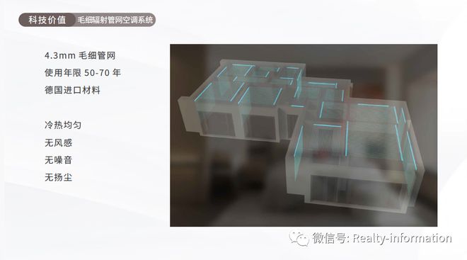 起源于德国,采用访生原理,将直径为4.3mm的毛细管席均匀铺设在顶棚或墙体内。是一种可代替常规空调的新型节能舒适系统。以水作为冷媒载体,通过均匀紧密的毛细管网调节室内温度。系统运作时做到了无噪音,无风感,无扬尘,冷热均匀。金茂府在全国40多个项目均采用此系统,技术非常成熟。