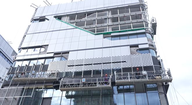 近日,记者来到瑞祥汽车文化产业园项目施工现场,工人们正在粉刷涂料大楼外墙,安装铝板幕墙,并加紧对园区道路、挡土墙等配套设施进行施工。“合同工期是365天,现在已完成投资额的97%,目前剩余的工作量是外墙涂料、外墙铝板幕墙,还有附属的种植绿化,以及挡土墙。”浙江新瑞建设集团有限公司项目负责人陈孝赏说。