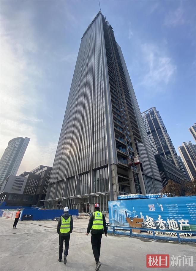 59层的塔楼顶端,风声呼啸。极目新闻记者看到,大楼塔冠顶部钢龙骨结构已然成型,头顶数十米高的立柱间,工人正在吊篮内进行玻璃安装,地面层工人则在进行焊接相关的作业。